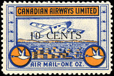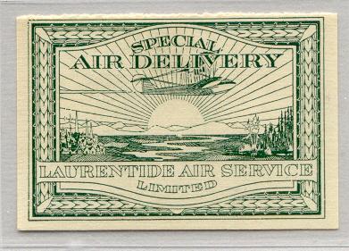 The First Semi-Official Air Mail stamp, produced by Laurentide Air Services in 1924. | The last of the Semi-Official Air Mail stamps, produced by Canadian Airways Limited in 1934. |